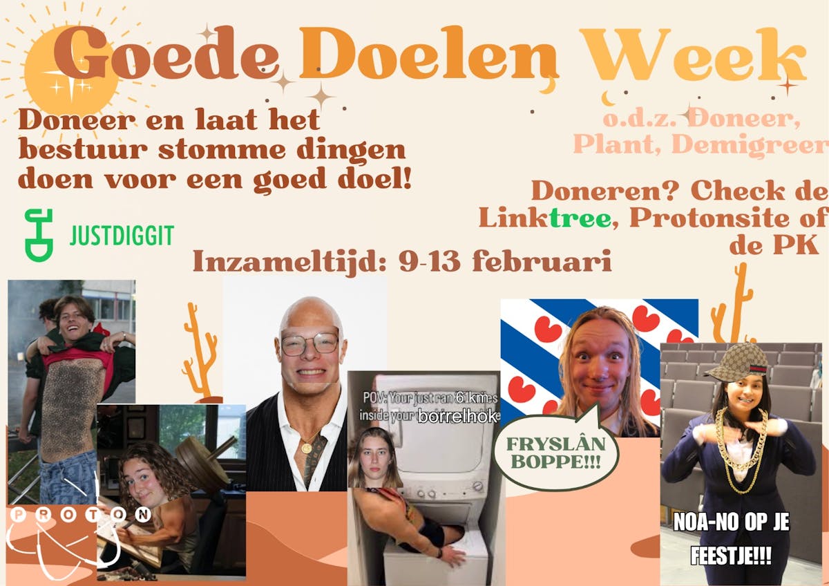 De Goededoelenweek is er weer! En dat betekent dat jullie kunnen doneren om het bestuur allemaal stomme dingen te laten doen!