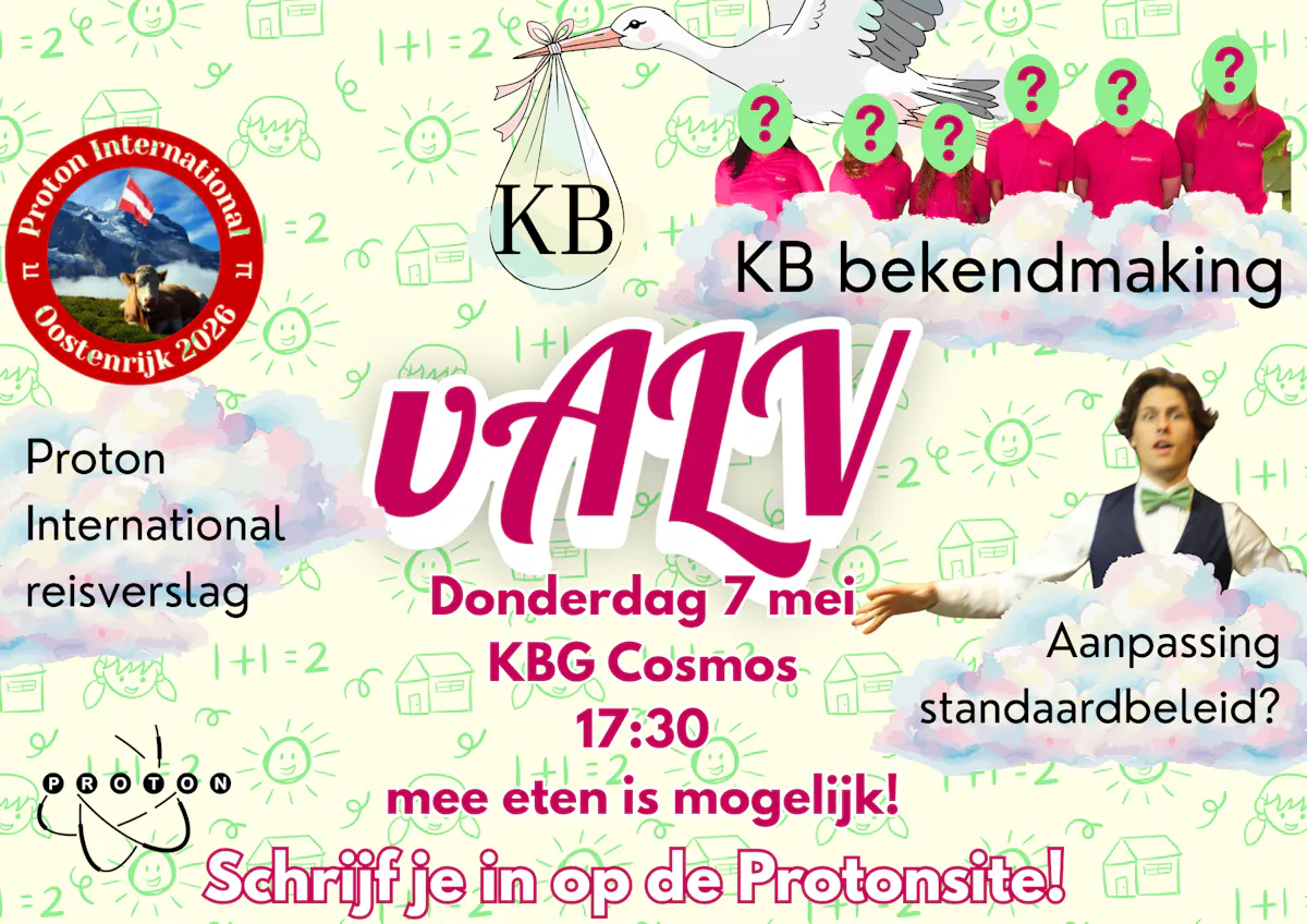 Hoera! Het is een kandidaadsbestuur(KB)!👶 Dolblij en gelukkig zijn wij met ons gloednieuwe KB.😊 Misschien hebben jullie de hints op Instagram al voorbij zien komen, maar nu wordt het echt.😱 Naast KB komen er ook nog wat andere onderwerpen langs.📜 Proton International presenteert de Afrekening van hun reis naar Wenen en ze zullen ook een uitgebreid reisverslag presenteren.🧳🚆 Daarnaast komen ook nog wat financiële punten op de agenda🤑: de halfjaarlijkse afrekening en er zal een financiële prognose gepresenteerd worden. Ook worden er een aantal puntjes bijgewerkt in het standaardbeleid! Spannend!!!🤯