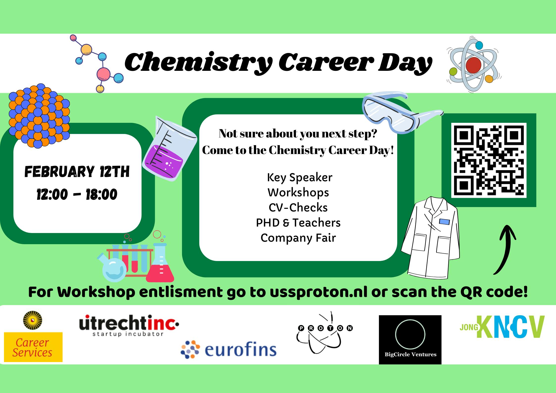 The 13th of February, the day has come: The Chemistry Career Day! The day features interesting workshops to give you a headstart in your career! At 12:00, there is a lecture by Amanda Garcia from the UVA. Following the lecture, you will get to learn if you want "to PhD or not to PhD". After that, the workshops are going to take place from 13:00-15:00 and the day will end with a company fair! This gives you the opportunity to get in contact with companies! This day is the perfect way to orient yourself on every step of your future in chemistry. There also is a possibility to get your CV checked, so bring it with you! If you want to join a workshop, sign up!!