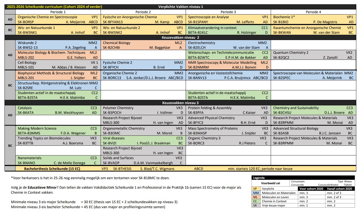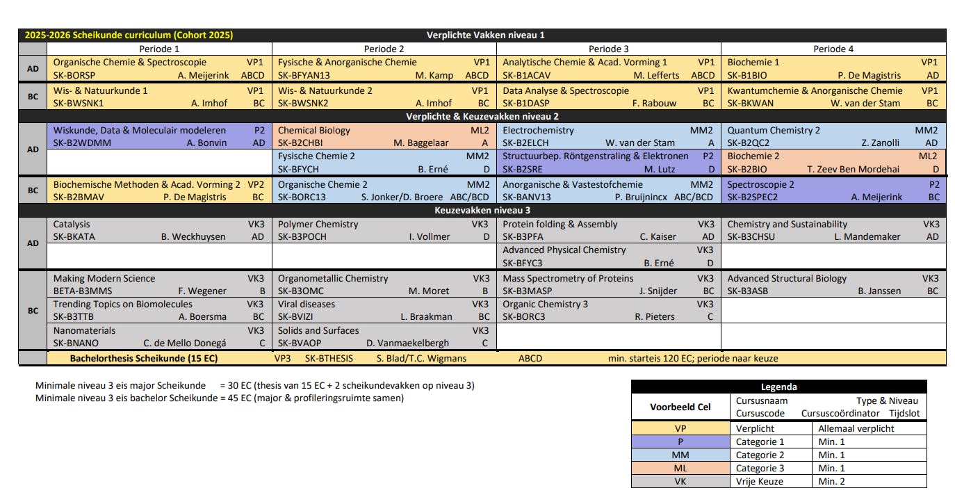 Hieronder is het curriculum voor scheikunde te zien, het curriculum voor ouderejaars en de dubbele bachelor Natuur- en Scheikunde staat onderaan de pagina.