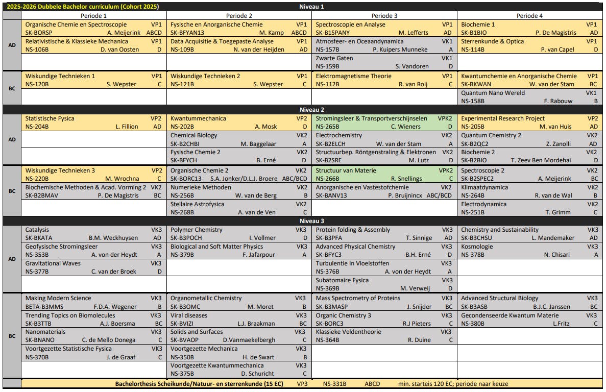 Het curriculum voor dubbele bachelor Natuur- en Scheikunde.